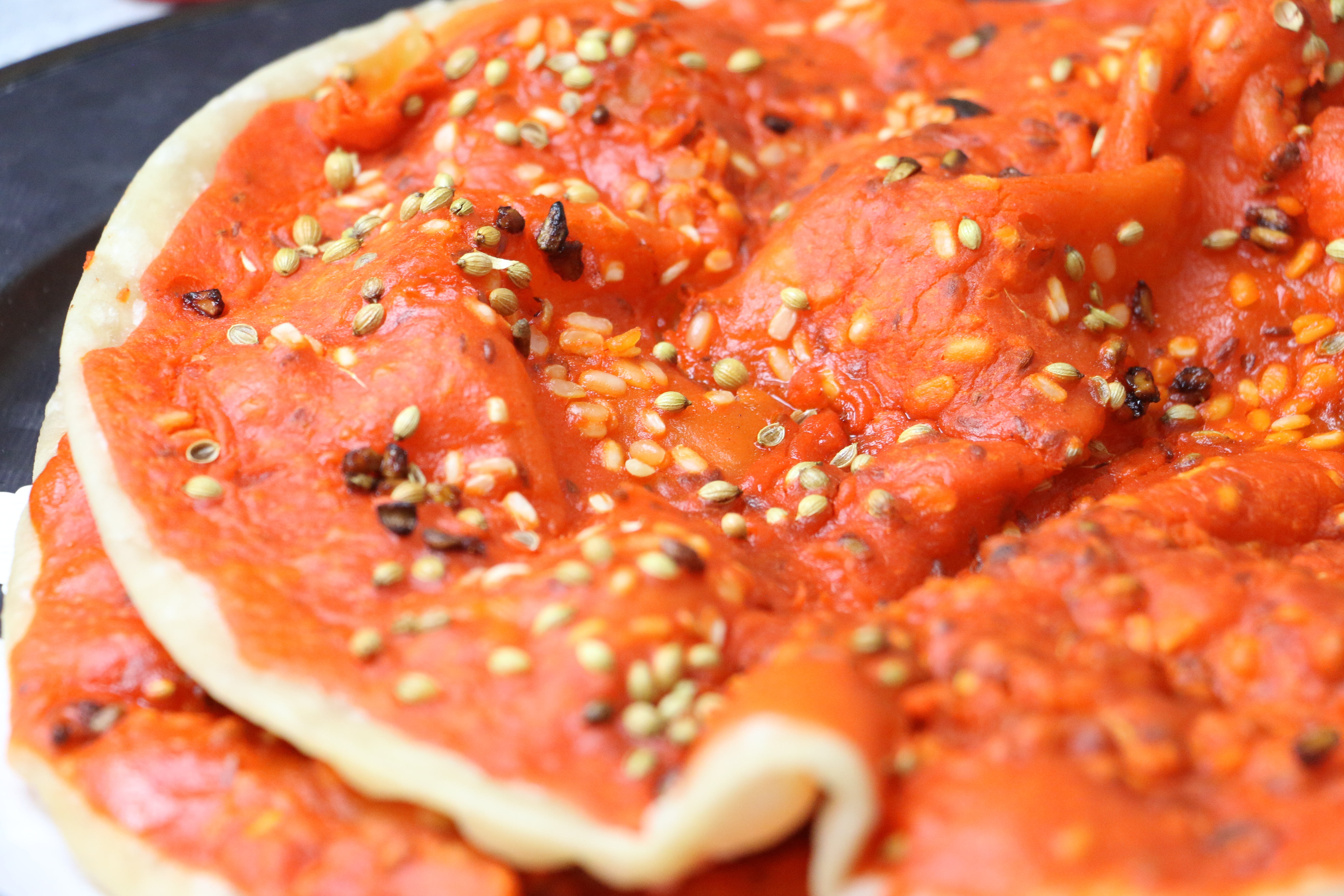 Qatlama or Katlama is a large-orange colored deep fried roti/poori topped with the layer of gram flour (besan) mixed with spices along with lentils, coriander seeds and pomegranate seeds.